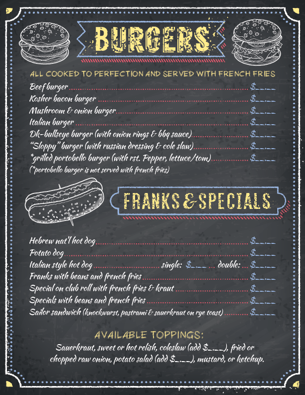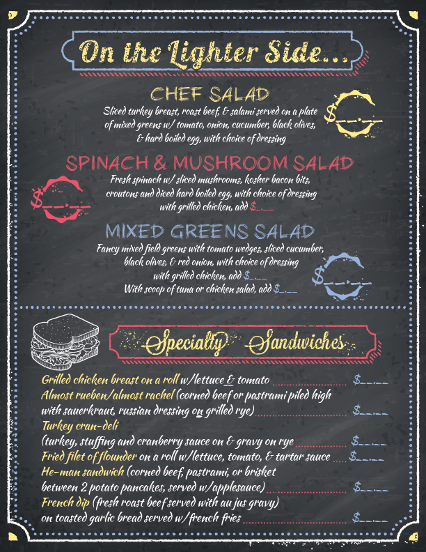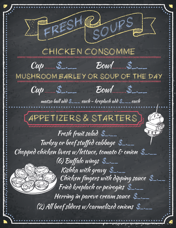 Includes choice of salad, starch, fresh vegetable, and bread, dinner rolls, or challah
