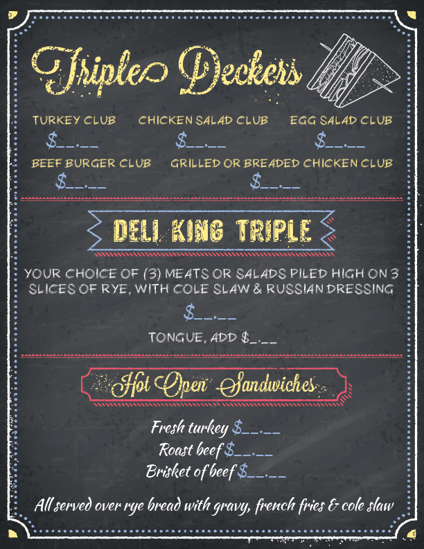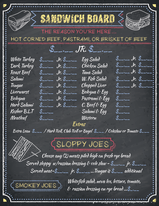 First Cut Corned Beef, Pastrami, Turkey and Roast Beef, Plattered and Decorated includes Our Homemade Potato Salad & Coleslaw, Assorted Relishes, Rye Bread, Dinner Rolls, Mustard & Russian Dressing.