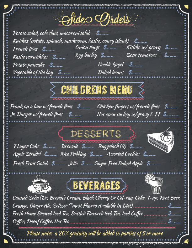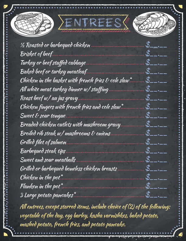 Includes 1/2 roasted chicken per person, choice of salad, starch, fresh vegetable, and bread, dinner rolls or challah